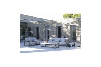 Les particularités du canapé 3 places Tonio : Confort mi-ferme, coussins acrylique déhoussables. Structure aluminium, peinture époxy. Mobilier d’e ...
